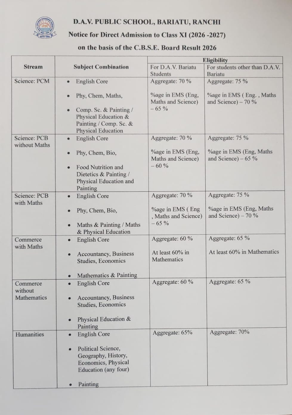For Admission in Class XI (2026-2027)