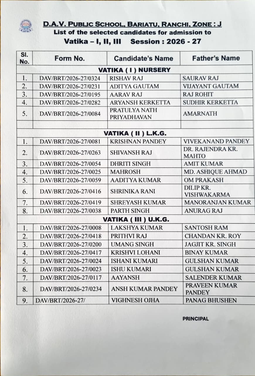 DAV PUBLIC SCHOOL, BARIATU CBSE affiliated (Affiliation No. 3430117) School No. 66312 DAV Campus, Opp. Bariatu Housing, Bariatu Road, Ranchi, Jharkhand - 834009 Contact : 916513103626, 9060745203, 06512973172 E-mail : [email protected] Website : www.davbariatu.org