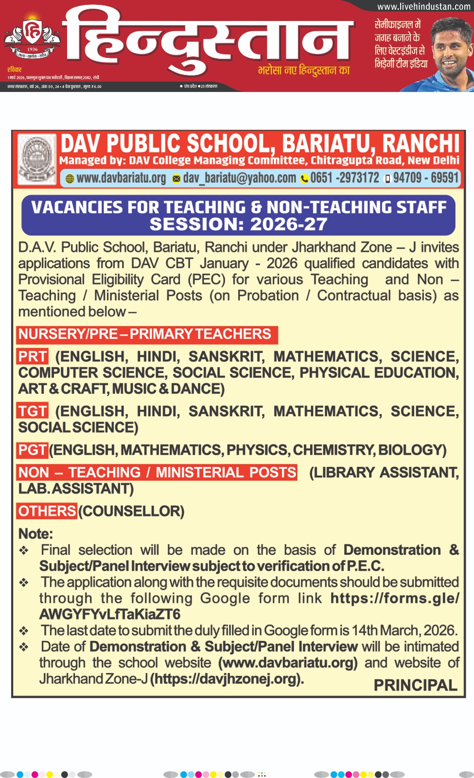Invites Application from DAV CBT Jan-2026 Qualified Candidates for Demo-cum-Interview